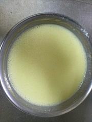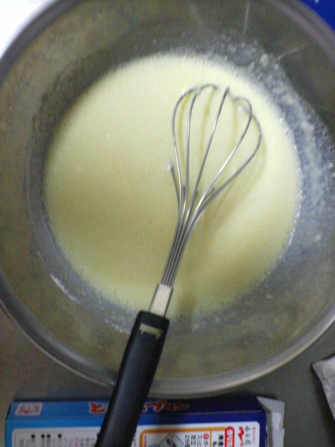 でっ「ミルクと簡単混ぜるだけ」ということで、ボールにプリンミックスを冷たいぎうにう入れ、泡だて器でゆっくりかき混ぜた。